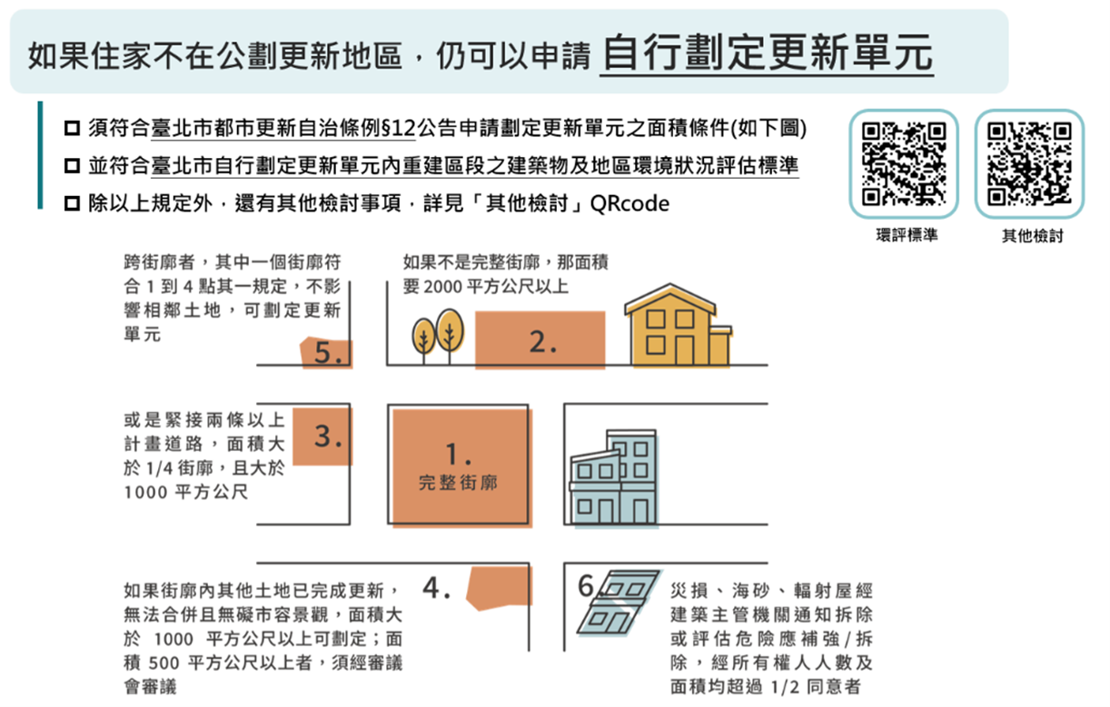1.土地及建物所有權人(單獨申請)或實施者(與事業計畫合併申請)得依都市更新條例第23條、「臺北市都市更新自治條例」第12、13條、「臺北市自行劃定更新單元重建區段作業須知」及「臺北市自行劃定更新單元內重建區段之建築物及地區環境狀況評估標準」規定,申請自行劃定更新單元。 2.申請應注意事項: (1)申請人:土地及合法建築物所有權人(至少1人)或實施者。 (2)基地規模應符合下列規定之一: A.完整街廓。 B.面積達2,000平方公尺以上。 C.臨接2條以上計畫道路,且面積達1,000平方公尺以上且大於該街廓1/4。 D.街廓內部分土地業已建築完成,確無法合併更新且無礙建築設計及市容觀瞻,其未建築完成部分面積達1,000平方公尺以上,並為一次更新完成者。但其面積在500平方公尺以上,經敘明理由,提經臺北市都市更新審議委員會審議通過者。 E.跨街廓更新單元之劃設,其中應至少有一街廓符合第1款至第4款規定之,並採整體開發且不影響各街廓內相鄰土地之開發者。